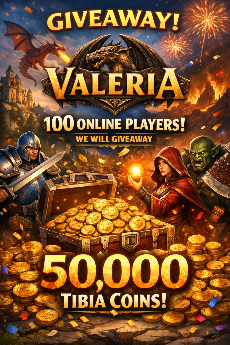 Giveaway Alert: 50,000 Tibia Coins! Hit 100 real players online (no x-log counts) and we’ll reward everyone online with 500 Tibia Coins. Once we reach it, stay online so Valeria or I can verify and reward you. Thanks for the increased activity this is our way of showing love!